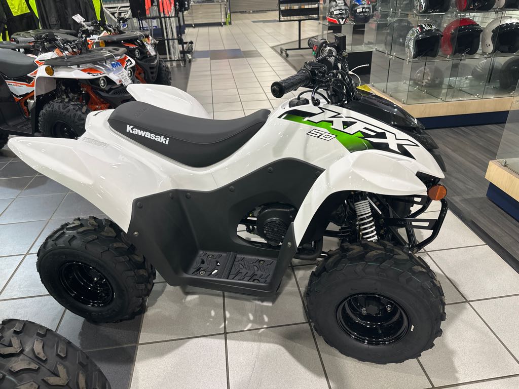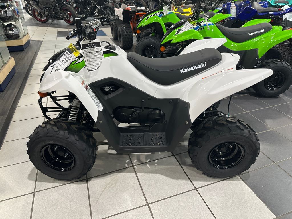 KAWASAKI CARES: Read Owner's Manual and all on-product warnings. Warning: ATVs can be hazardous to operate. For your safety: Always wear a helmet, eye protection, and protective clothing. Never carry a passenger. Never ride under the influence of drugs or alcohol. Never ride on public roads or pavement. Avoid excessive speeds and stunt driving. Be extra careful on difficult terrain. Kawasaki's KFX®50 is recommended for use only by persons 6 or older, and the KFX®90 is recommended for use only by persons 10 and older. All children under 16 riding ATVs should always have direct adult supervision. Kawasaki ATVs with engines over 90cc are recommended for use only by persons 16 years of age or older. Kawasaki also recommends that all ATV riders take a training course. For more information, see your dealer, call the ATV Safety Institute at 1-800-887-2887, or go to www.atvsafety.org. ©2026 Kawasaki Motors Corp., U.S.A.