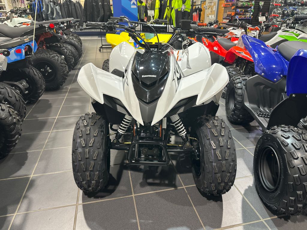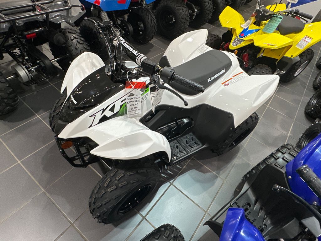 KAWASAKI CARES: Read Owner's Manual and all on-product warnings. Warning: ATVs can be hazardous to operate. For your safety: Always wear a helmet, eye protection, and protective clothing. Never carry a passenger. Never ride under the influence of drugs or alcohol. Never ride on public roads or pavement. Avoid excessive speeds and stunt driving. Be extra careful on difficult terrain. Kawasaki's KFX®50 is recommended for use only by persons 6 or older, and the KFX®90 is recommended for use only by persons 10 and older. All children under 16 riding ATVs should always have direct adult supervision. Kawasaki ATVs with engines over 90cc are recommended for use only by persons 16 years of age or older. Kawasaki also recommends that all ATV riders take a training course. For more information, see your dealer, call the ATV Safety Institute at 1-800-887-2887, or go to www.atvsafety.org. ©2026 Kawasaki Motors Corp., U.S.A.